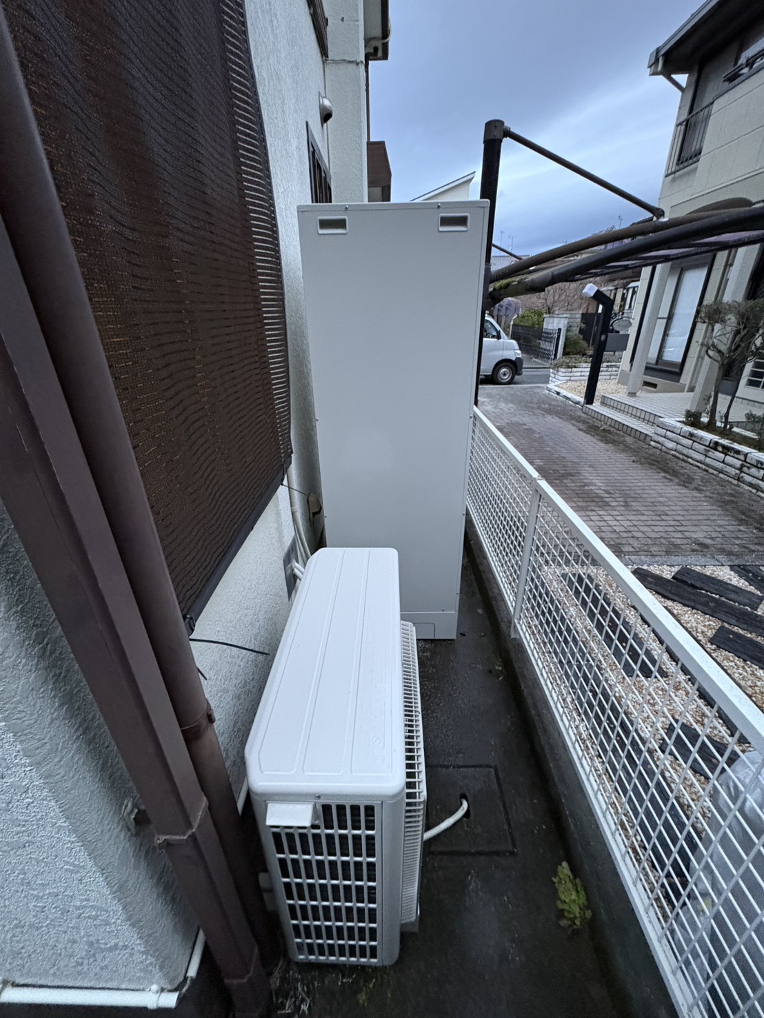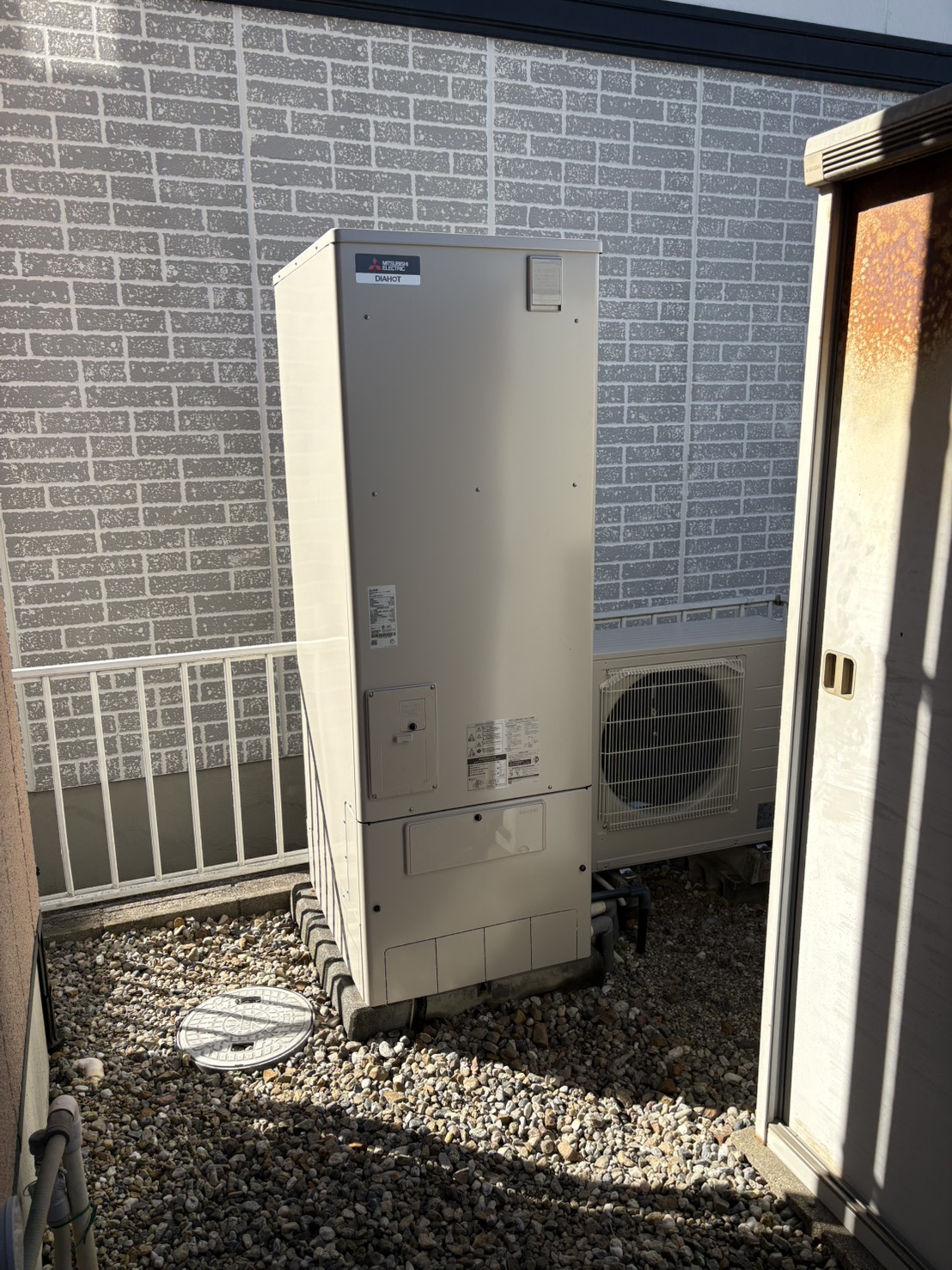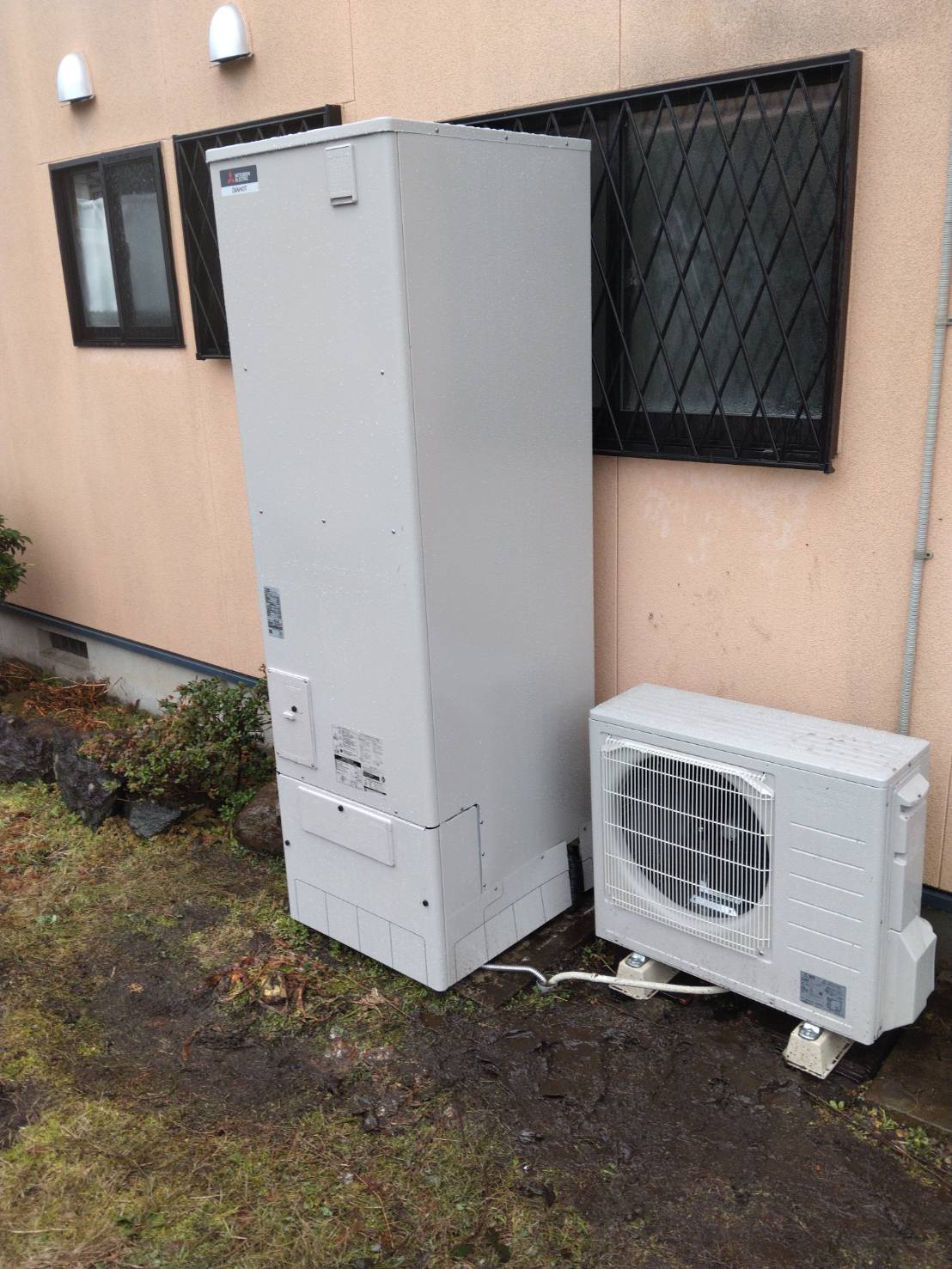 今回は、交換前と同じ三菱電機製のエコキュートに交換。植栽を傷つけないようにスペースを作りながら設置さ...