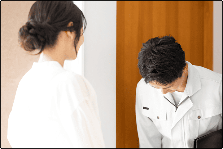 作業スタッフの身だしなみや言葉遣い、行動に不安を感じる方もいらっしゃるかもしれません。当社では、お客様に快適にご利用いただけるよう、マナー教育や整理整頓、清掃に力を入れています。作業中も気持ちよくお過ごしいただけるよう配慮しておりますので、どうぞ安心してお任せください。